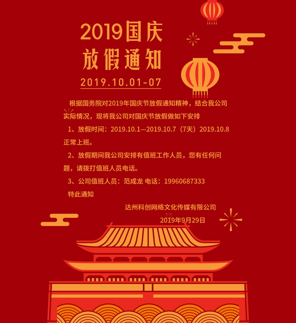 辭舊歲賀新年,2024春節(jié)即將來了, 根據(jù)國家法定節(jié)假日規(guī)定 結(jié)合我司現(xiàn)狀特將我司放假情況公布如下:放假時間: 2024年2月8日-2月18日至此新年來臨之際向您獻(xiàn)上最真摯的祝福 ...